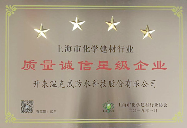 上海市化學建材行業協會第七屆第三次會員代表大會于2019 年2月 28 日 召開,備受業界矚目的“上海市化學建材行業質量誠信星級企業”名單如期揭曉。開來濕克威防水科技股份有限公司榮獲“質量誠信四星級企業”稱號。