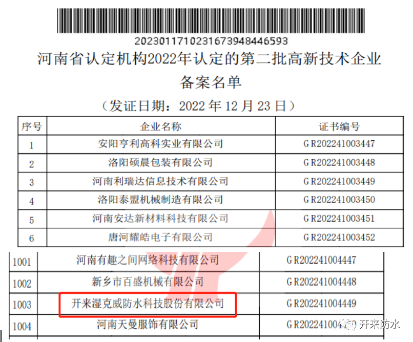 近日,開來濕克威防水科技股份有限公司順利通過《高新技術企業認定管理辦法》(國科發火字〔2016〕32號)和《國家高新技術企業認定管理工作指引》(國科發火字〔2016〕195號)有關規定,在科技部火炬高技術產業開發中心于關于對河南省認定機構2022年認定的第二批高新技術企業進行備案的公示名單中,開來濕克威防水科技股份有限公司正式被評定為國家級高新技術企業!