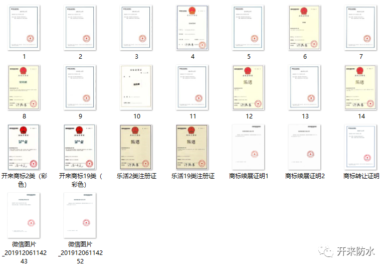 開來實施品牌戰略,不斷提升品牌形象,4個注冊商標分別用于工程裝系列防水材料、家裝系列防水材料、定制系列防水材料以及特種系列防水材料的應用,品牌群落知名度在業內迅速提高。