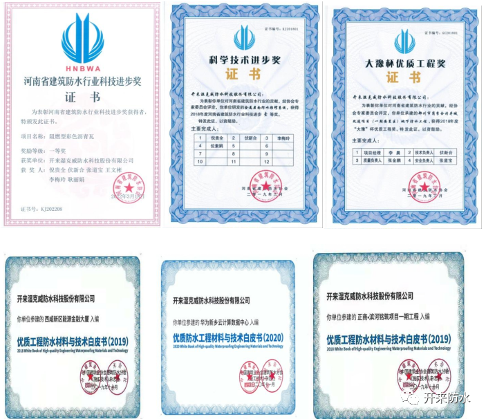 公司開展的研發多項成果獲得行業領域的高度評價,其中“阻燃型彩色瀝青瓦”成果榮獲河南省建筑防水協會2021年度科技進步一等獎;“金屬屋面防水修繕系統”獲得河南省建筑防水協會頒發的科技進步獎一等獎,“鄭州市崗李合村并城改造項目(一期安置區)地下防水工程”成果榮獲河南省建筑防水協會“大豫杯”優質工程獎,西咸新區能源金融大廈、華為新鄉云計算數據中心、正商·濱河銘筑一期工程分別入選中國建筑業協會建筑防水分會和建筑施工技術雜志社辦法的優質工程防水材料與技術白皮書。開來濕克威的知名度和行業影響力得到快速提升。