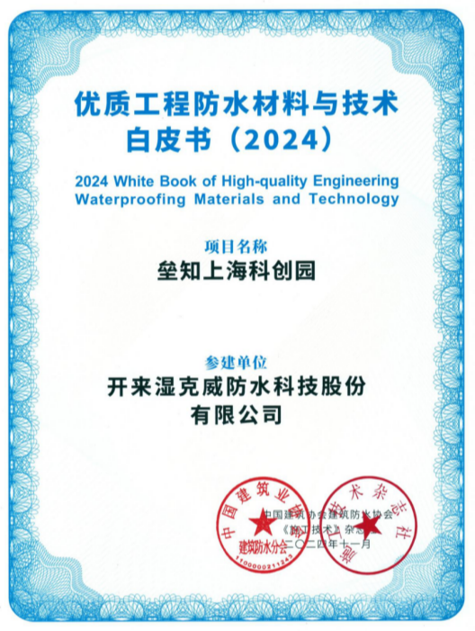 開來濕克威防水科技股份有限公司參建的壘知上海科創(chuàng)園項(xiàng)目入選《優(yōu)質(zhì)工程防水材料與技術(shù)》白皮書。