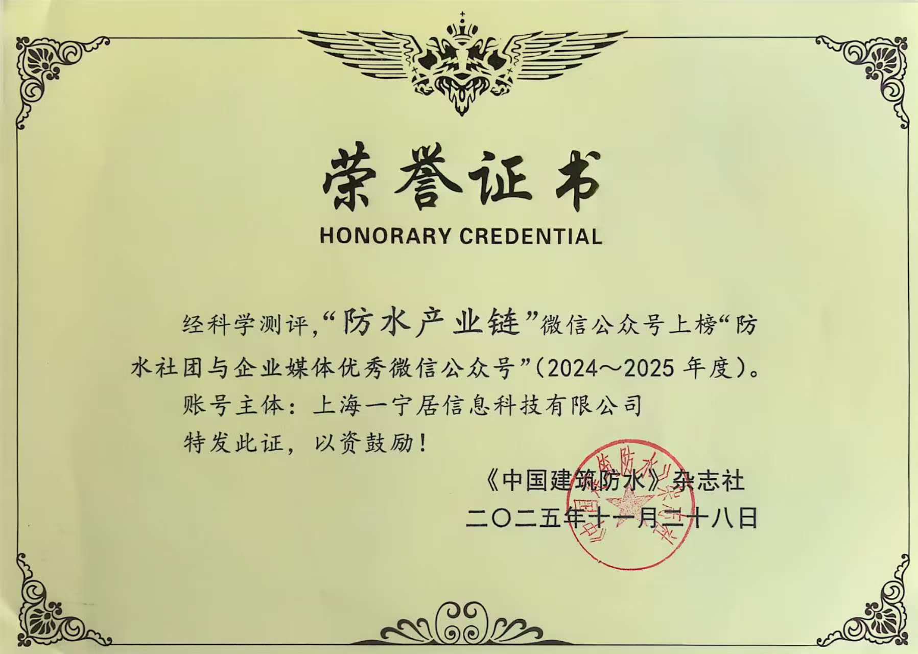 上海一寧居信息科技有限公司旗下核心新媒體平臺(tái)——“防水產(chǎn)業(yè)鏈”公眾號(hào),憑借專業(yè)深耕的內(nèi)容創(chuàng)作、廣泛的行業(yè)影響力及對(duì)產(chǎn)業(yè)鏈發(fā)展的深度洞察,成功獲評(píng)《2024-2025 防水社團(tuán)與企業(yè)媒體優(yōu)秀公眾號(hào)》稱號(hào)。作為聚焦防水產(chǎn)業(yè)的垂直新媒體標(biāo)桿,“防水產(chǎn)業(yè)鏈”公眾號(hào)始終以“防水產(chǎn)業(yè)數(shù)智賦能,資源共享”為核心,長(zhǎng)期深耕行業(yè)資訊傳播、前沿成果分享與產(chǎn)業(yè)鏈資源整合,為防水行業(yè)上下游從業(yè)者提供及時(shí)、全面、專業(yè)的信息服務(wù),已成為連接產(chǎn)業(yè)各方、推動(dòng)數(shù)智化傳播的重要載體。此次獲評(píng)優(yōu)秀公眾號(hào),是行業(yè)對(duì)平臺(tái)內(nèi)容專業(yè)性、傳播價(jià)值與資源整合能力的高度肯定。