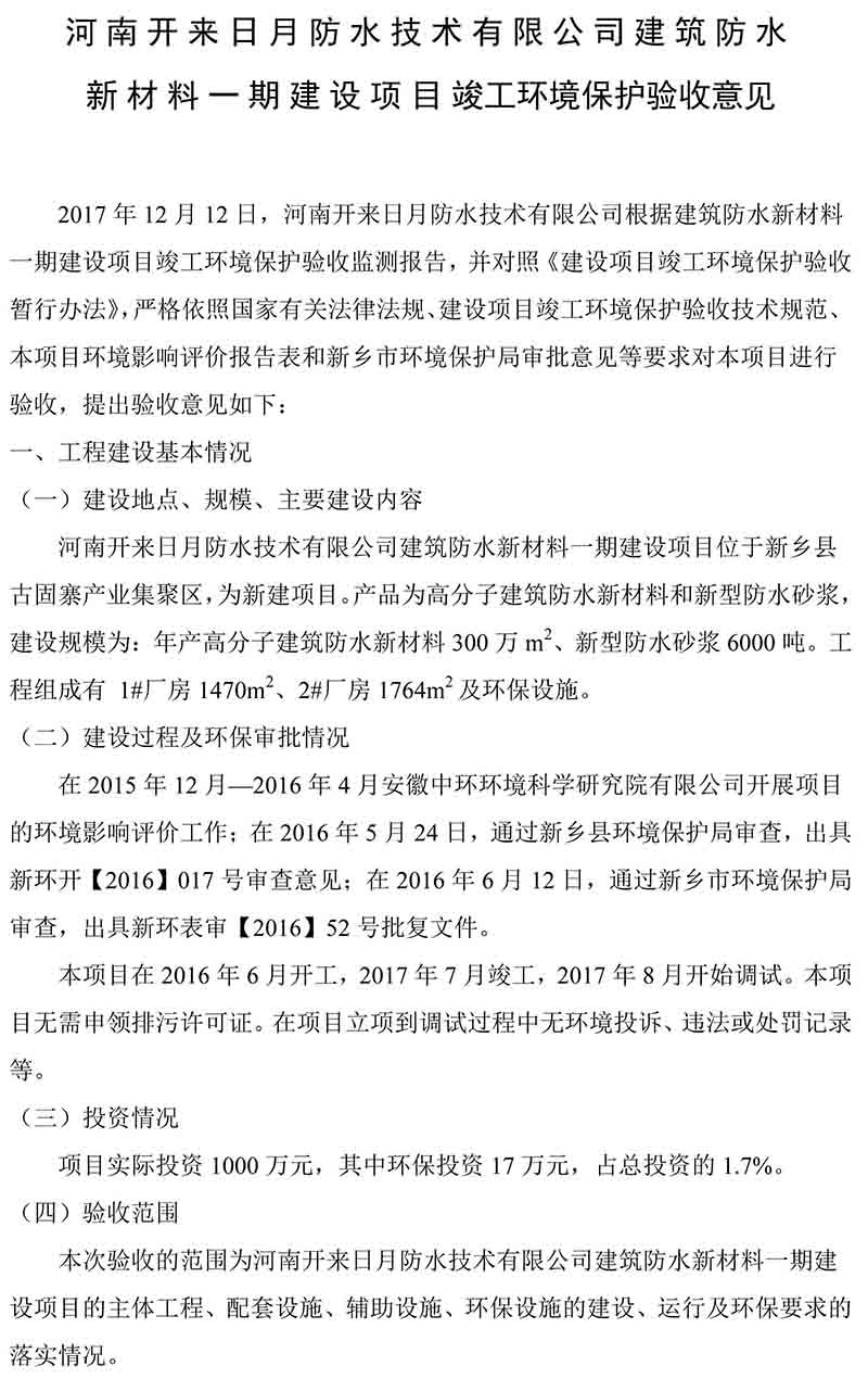 我公司建筑防水新材料建設項目于2015年12月在新鄉縣發改委備案,2016年6月通過新鄉市環境保護局審查,取得環評批復;2016年6月一期工程開始建設,2017年7月一期工程竣工。根據《建設項目環境保護管理條例》(國務院令第682號)和《關于規范建設單位自主開展建設項目竣工環境保護驗收的通知》(環辦環評函[2017]1235號)等文件的要求,組織建設單位、檢測公司等單位及環保專家于2017年12月份進行了一期工程進行驗收,現對驗收監測結論予以公示。