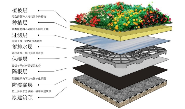 要不要蓄水層應依覆土厚度和地區氣候而定。當覆土厚度大于50cm,有足夠的自身蓄水能力,可以不設蓄水層,只在土層上設排水層即可。當覆土小于30cm厚,自身蓄水較少,數天無雨土層便干旱,應加設蓄水層以備干旱時反滲、潤澤種植土。在少雨或暴雨地區,應考慮設置蓄水層,目的是盡量不讓雨水排走。